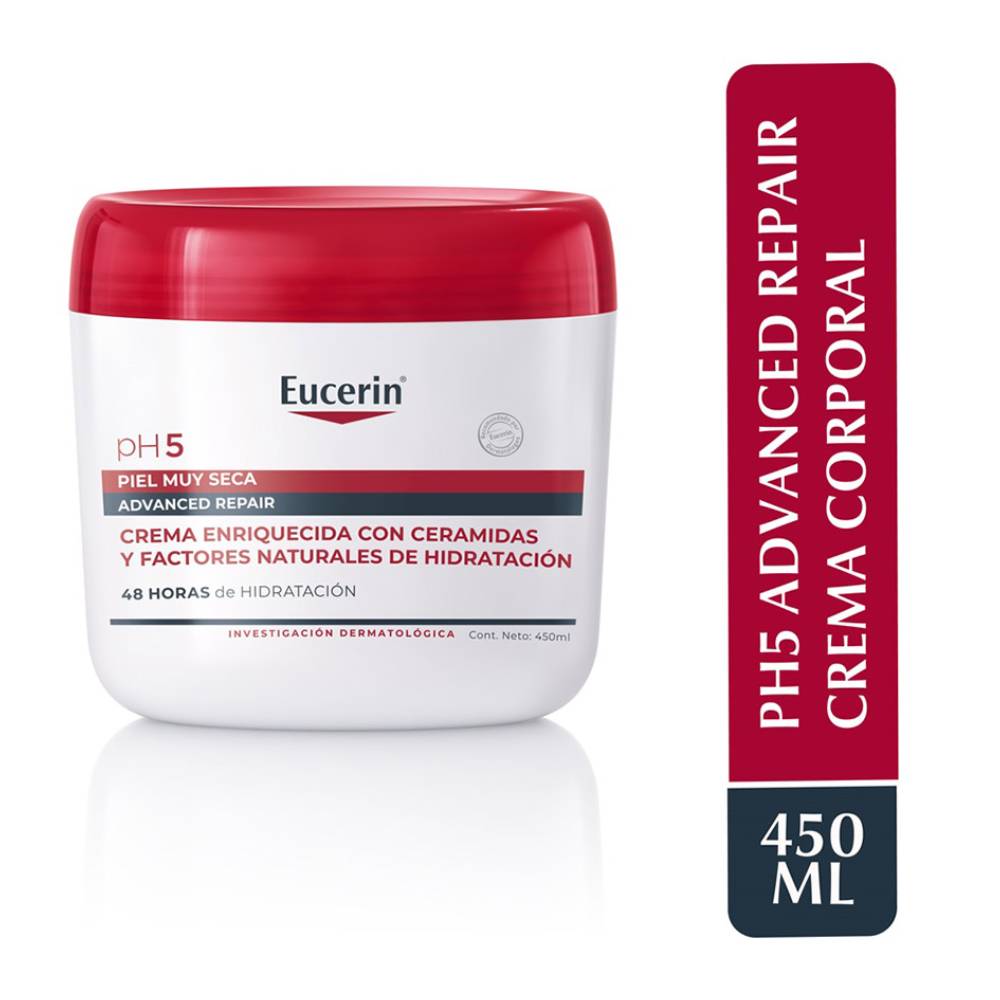 Eucerin Advanced Repair Crema Corporal, contiene una nueva fórmula de hidratación y humectación avanzada para la piel muy seca. Enriquecida con Ceramidas que ayudan a fortalecer la barrera protectora de la piel manteniéndola humectada y Factores Naturales de Hidratación siendo una combinación de ingredientes que se encuentran originalmente en la piel y que ayudan a hidratar intensamente para ayudar a prevenir la sequedad en la piel. Libre de perfumes conocidos por causar alergias. Adecuado para adultos, incluidos aquellos con piel madura y / o piel seca provocada por la diabetes, y para niños mayores de tres años. También se puede utilizar para cuidados complementarios.