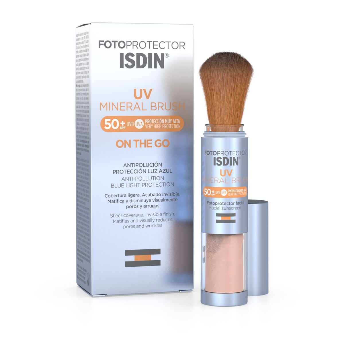 Fotoprotector facial en brocha que ofrece protección contra la luz azul, efecto antipolución y alta protección SPF 50+ frente a la radiación UVB y UVA.
