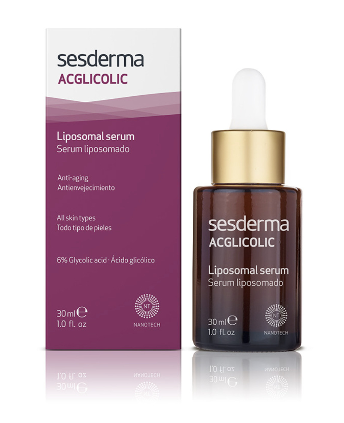 Serum antienvejecimiento concentrado con ácido glicólico libre y liposomado que renueva, regenera e hidrata la piel. Ideal para todo tipo de piel como tratamiento de base.