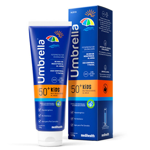 Umbrella Kids Resistente al Agua SPF 50+ es un protector solar especialmente diseñado para niños, altamente especializado, de amplio espectro, que según los estándares internacionales actuales, brinda muy alta protección y muy alta resistencia al agua (80 minutos de inmersión). Actúa contra las radiaciones en el rango UVB/UVA, visible e infrarroja. Por su SPF 50+ bloquea el 98% de la radiación solar, ofreciendo la máxima protección contra las quemaduras solares, el envejecimiento prematuro, así como las alteraciones celulares en la piel causadas por el sol. Contiene una balanceada combinación de filtros solares fotoestables, que garantizan una eficacia sostenida durante todo el tiempo de uso del producto.